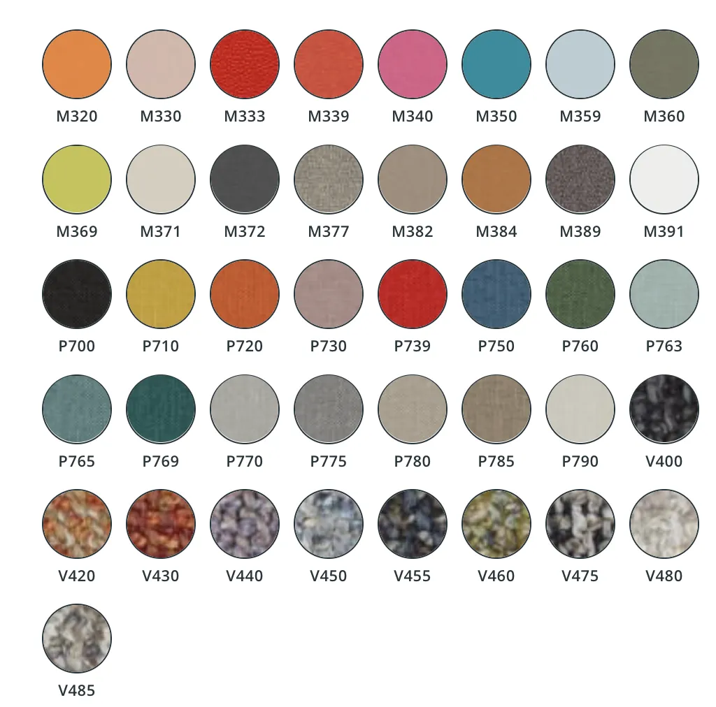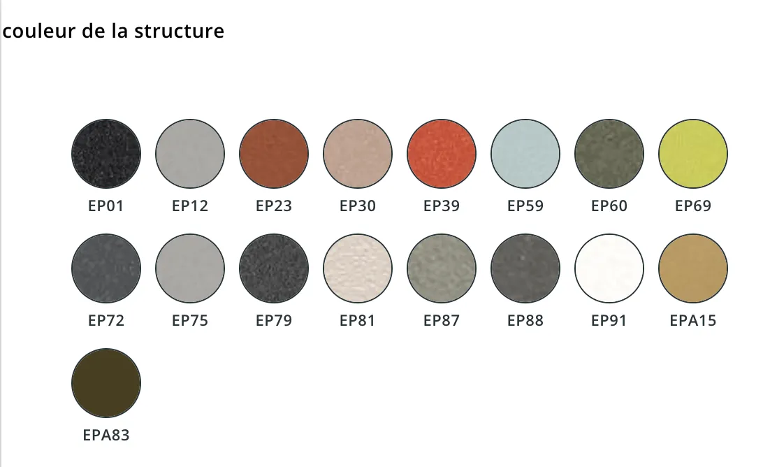 En photo les revêtements possibles ainsi que les couleurs de structures (pied) disponibles.