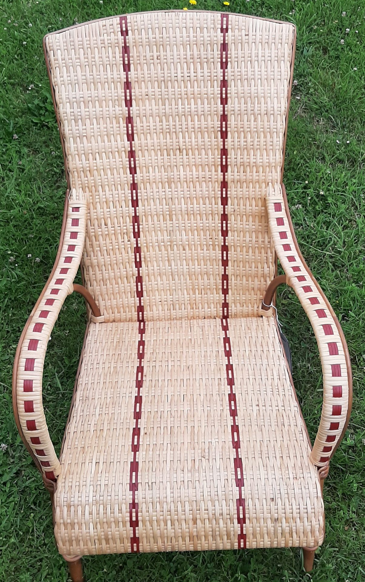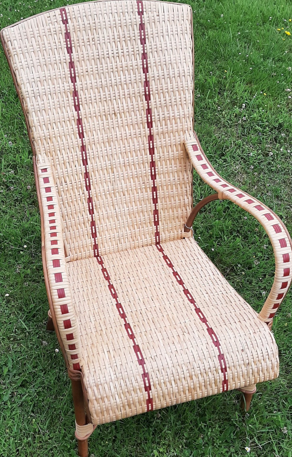 Structure rotin non écorcé foncé naturel, tressage en éclisse de rotin patinée et résine PEHD (parties rouges), cadre d'assise en bois massif garni de sangles. Vernis à l'eau satiné.