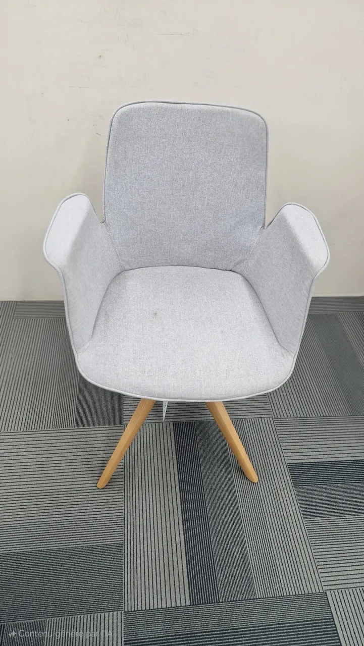 Piétement pivotant avec retour automatique en hêtre massif plaqué chêne et métal laqué époxy noir, assise et dossier en tissus sur mousse densité 26kg/m².