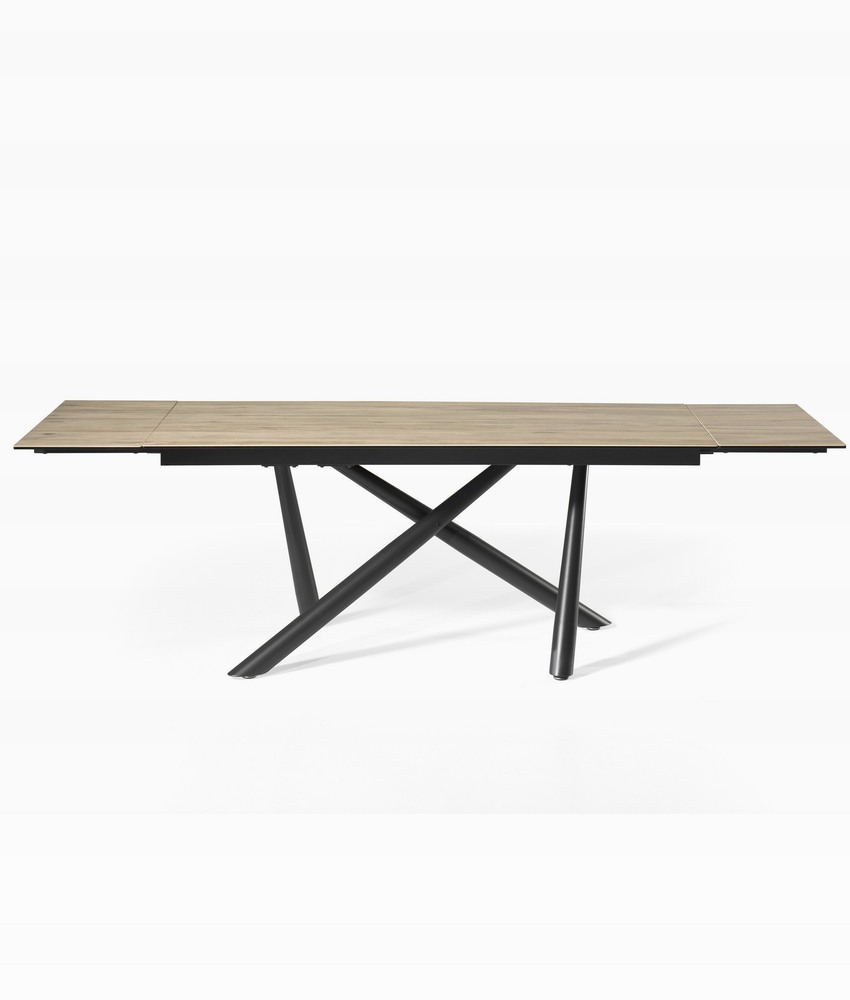 Table extensible SCALA, structure en acier noir mat et plateau céramique imitation chêne.
